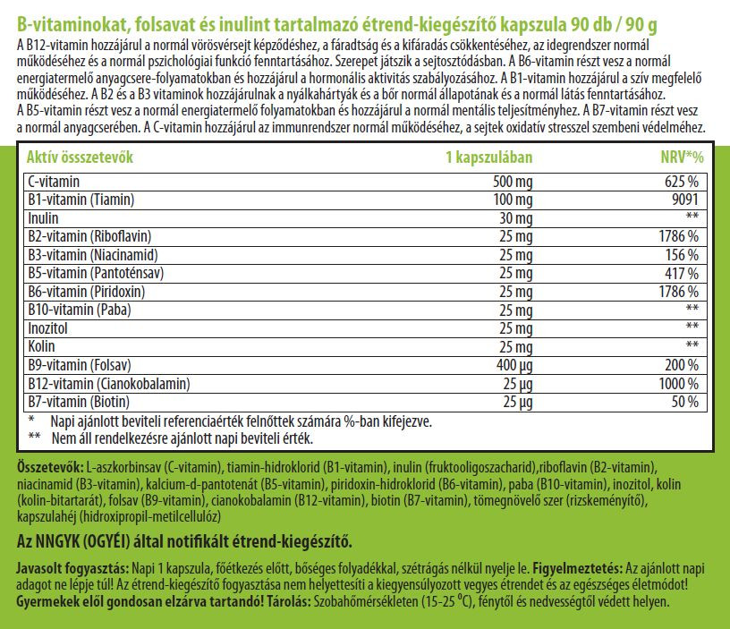 Komplex készítmény 10 értékes és létfontosságú B-vitaminnal, C-vitaminnal, Inozitollal, bioaktív szerves cinkkel az idegrendszer kiegyensúlyozott működéséért. Ezek a vitaminok szolgáltatják a sejtek számára az energiát, a bevitt táplálékból alakítják át. Segítenek fenntartani az idegek, a máj, a bőr, a szem és a haj egészségét, az izmok megfelelő mozgását, a gyomor- és bélrendszer szabályos működését, valamint normál agyműködést biztosítanak.