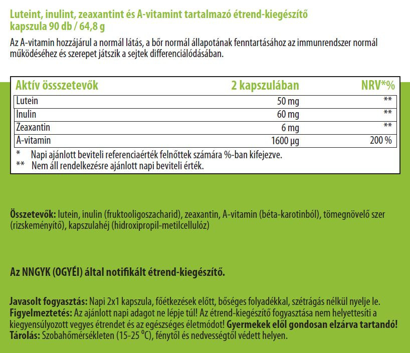 Amennyiben nem megoldható, hogy rendszeresen fogyasszon (legalább heti kétszer) lutein és zeaxantin tartalmú élelmiszereket, akkor lutein tartalmú étrend-kiegészítővel pótolhatja.