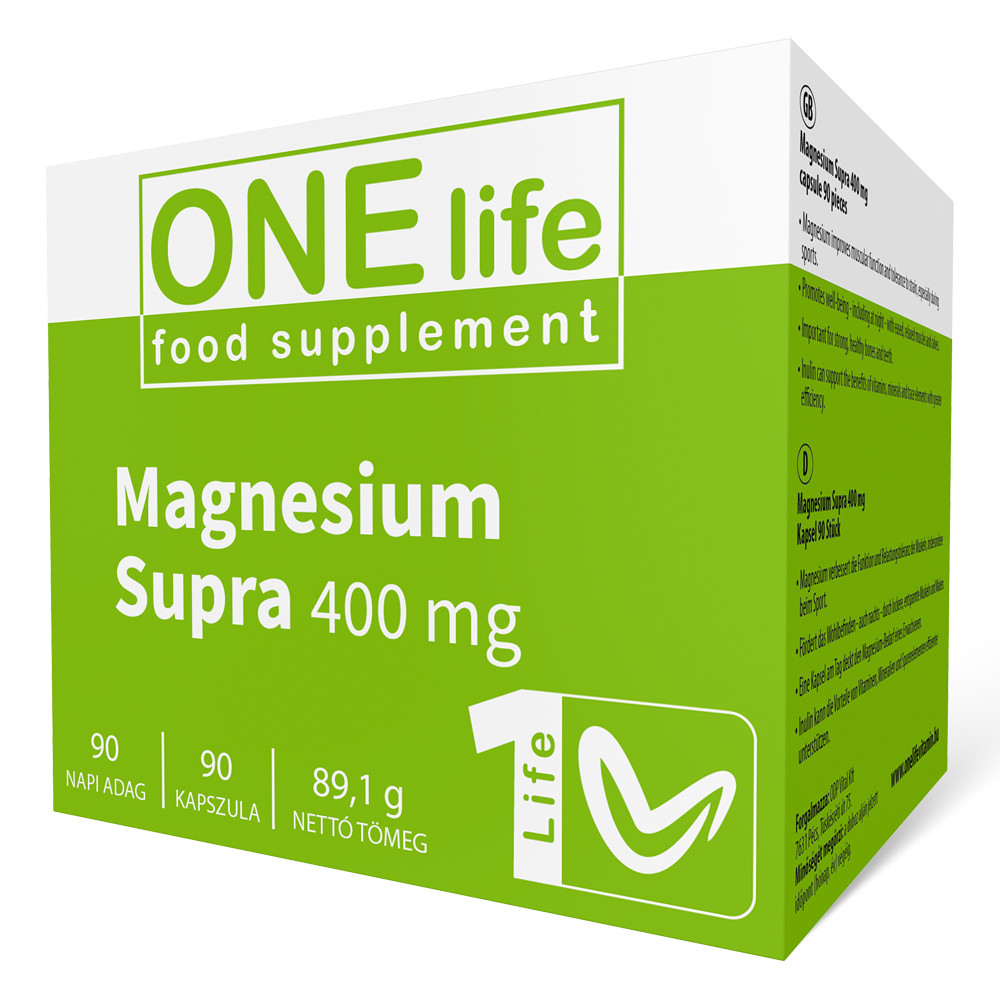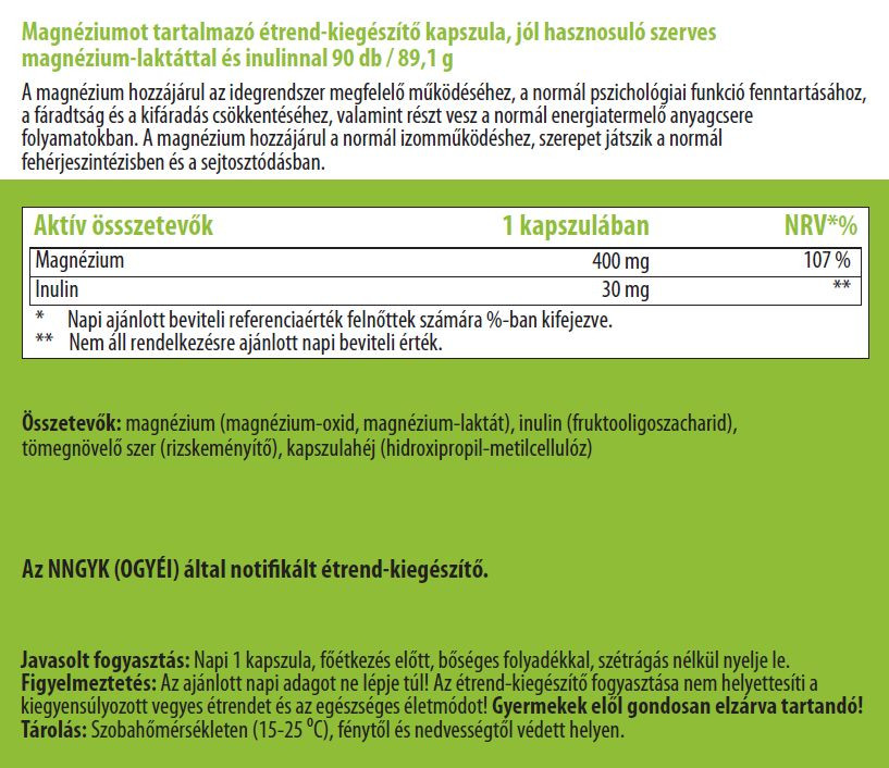 Magas dózisú, jól felszívódó bioaktív készítmény kapszulánként 400 mg Magnéziummal és hozzáadott Inulinnal.