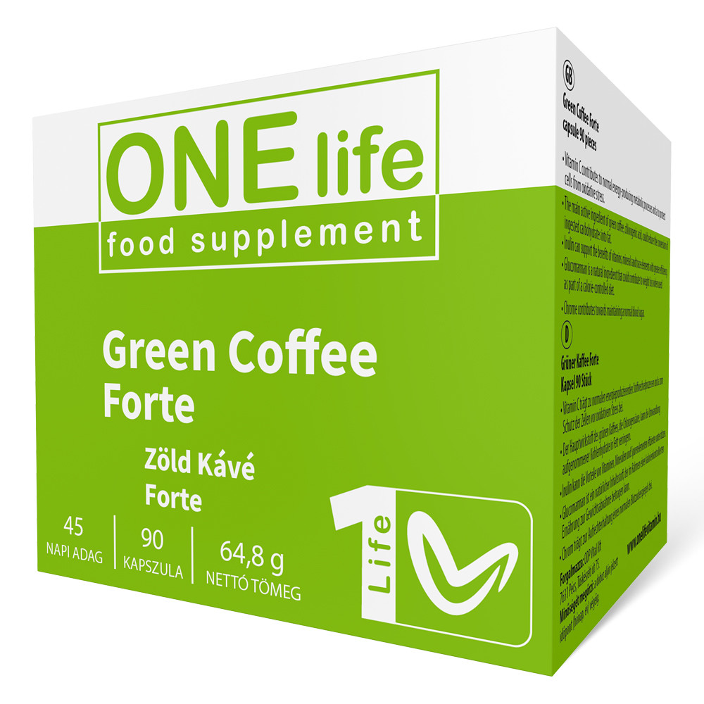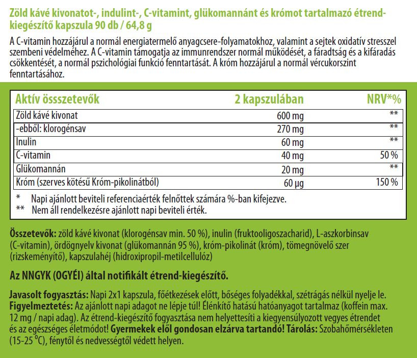 Kapszulánként 300 mg zöld kávé extraktum, 45 %-os klorogénsav tartalommal, hozzáadott C-vitaminnal, Glükömannánnal.